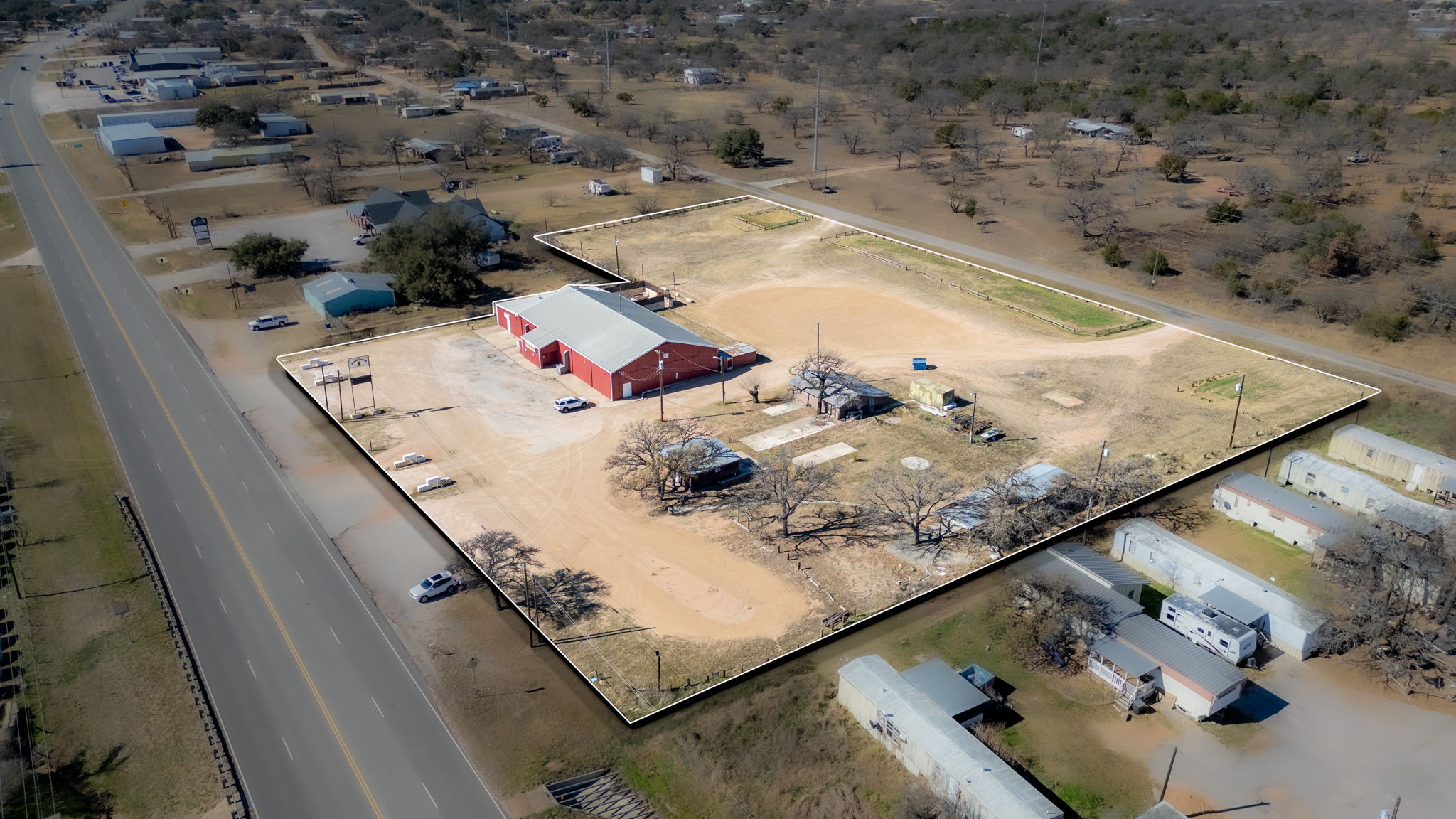 Unrestricted commercial property on TX-29 in the Highland Lakes growth corridor. Approx. 2.62 acres (subject to survey/plat) withan approx. 8,500+ SF building, approx. 200’ of highway frontage, and rare street-to-street access—ideal for easy traffic flow, deliveries, and flexible parking. Large open interior layout with additional rooms/areas supports a wide range of uses including storage, warehouse, retail, restaurant, church, contractor yard, mixed-use redevelopment, or event/venue concept. High-visibility location serving Buchanan Dam, Burnet, Marble Falls, Llano and the Lake Buchanan region. Rare combination of highway exposure, usable acreage, and substantial improvements—excellent opportunity for owner-user or investor. Shown by appointment only. Sellers Spouse LREA